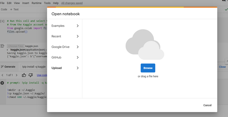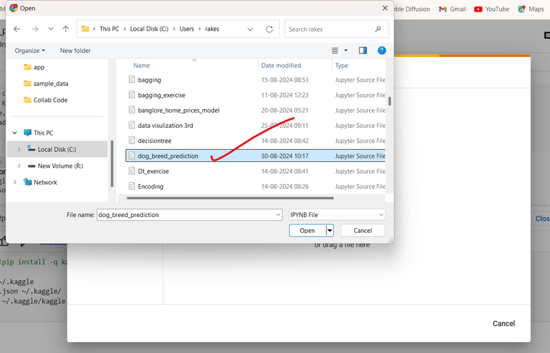 A file picker will appear. Choose the Jupyter Notebook file (.ipynb) from your local machine.