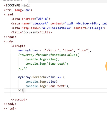 In this example, we have an array called myArray that contains the numbers 1 through 5. We use the forEach() method to loop through the array, and we pass an arrow function as an argument to the forEach() method. The arrow function takes one parameter (element) that represents each element of the array as it is iterated over.