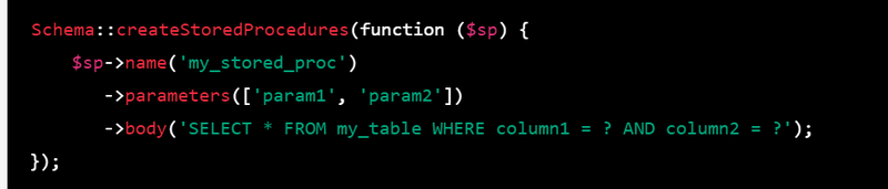 Schema::createStoredProcedures(function ($sp) {
