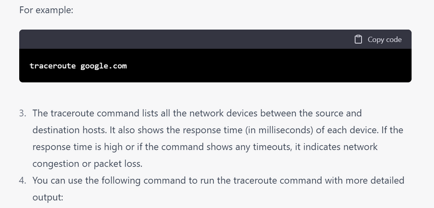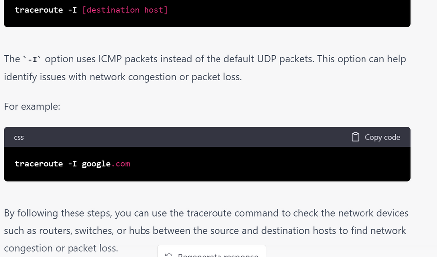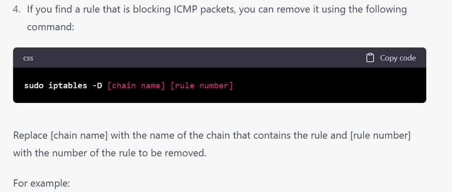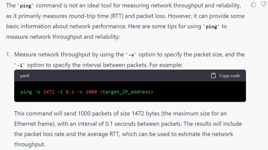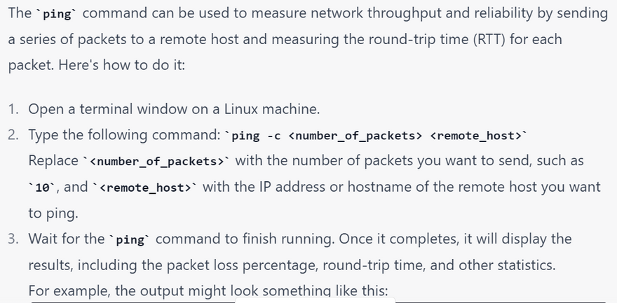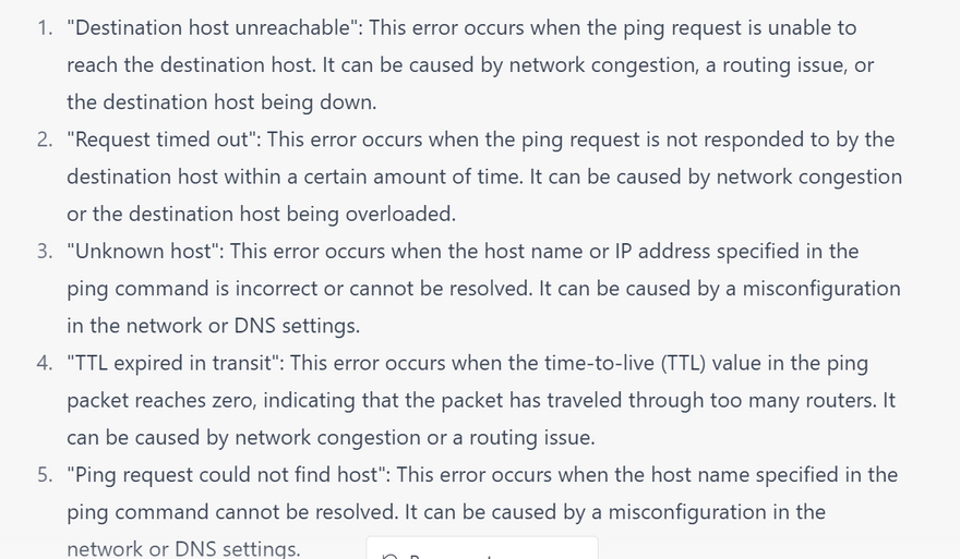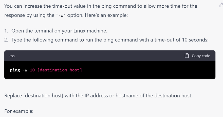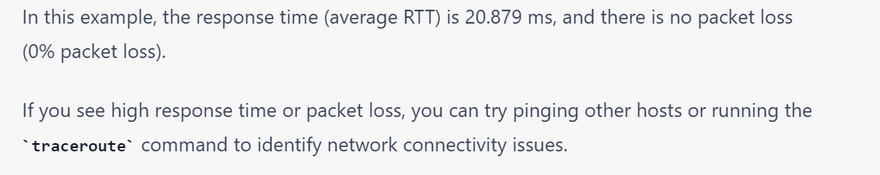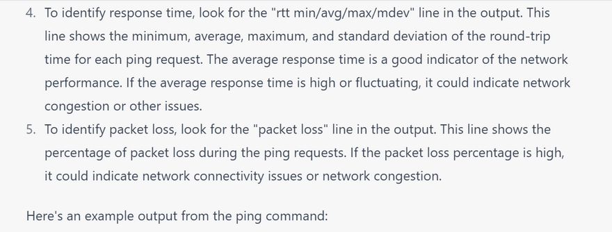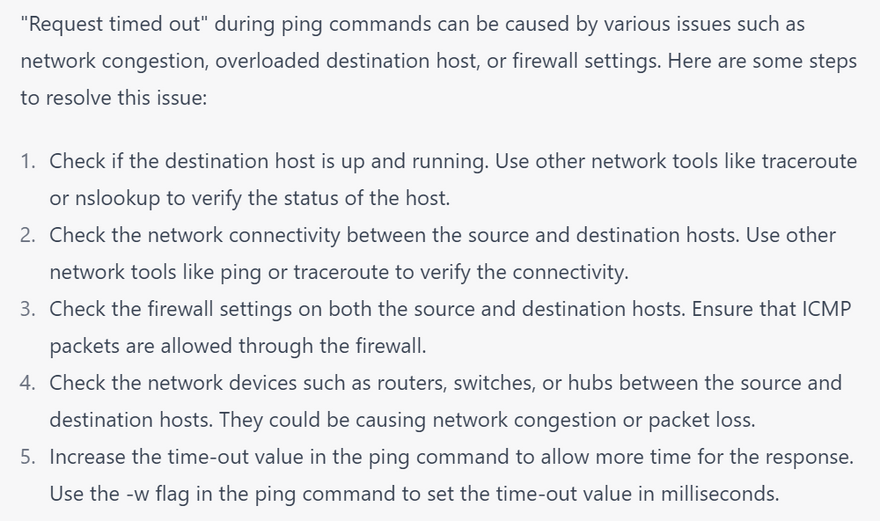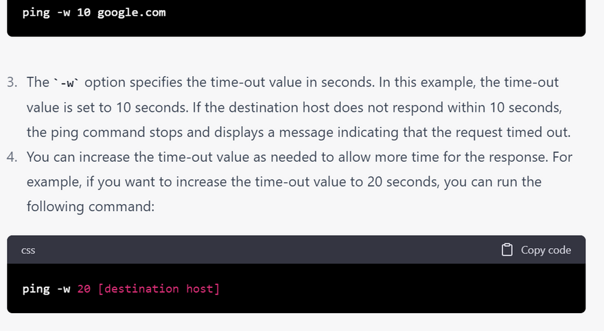 4.Timeouts: This error occurs when the ping command is taking too long to receive a response from the remote host. To troubleshoot this issue, try increasing the timeout value using the -W option. Here's an example of what the output might look like: