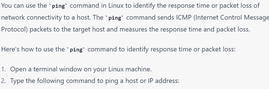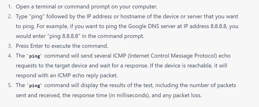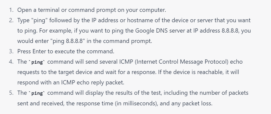The ping command is a simple yet powerful networking tool that is used to test the reachability and response time of a network device, such as a server or a router. The ping command works by sending an ICMP (Internet Control Message Protocol) echo request packet to the target device and waiting for a response. Here are some key uses of the ping command:
