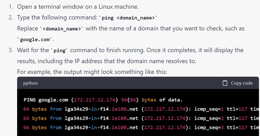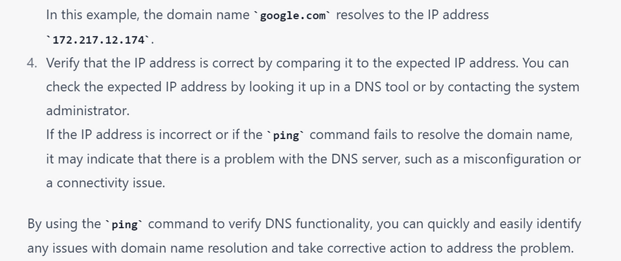 Testing DNS resolution: The ping command can be used to test whether a DNS server is functioning properly. By pinging a domain name, the ping command can verify that the DNS server is able to resolve the domain name to an IP address.
