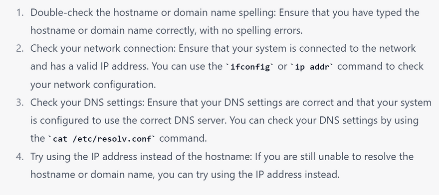 If you encounter the "Unknown host" error message when running a Linux command, it typically means that the system is unable to resolve the hostname or domain name to an IP address. Here are some steps you can take to resolve the issue: