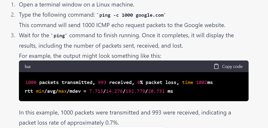 3.Wait for the ping command to finish running. Once it completes, it will display the results, including the number of packets sent, received, and lost.