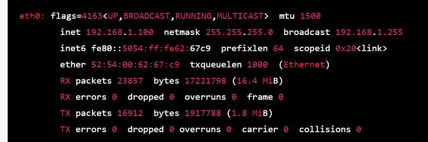 In this example, the eth0 interface is up and running, with an IP address of 192.168.1.100 and a netmask of 255.255.255.0.