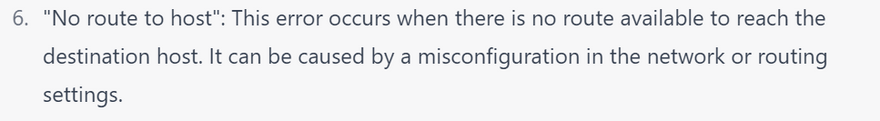 1.Host not reachable: This error occurs when the remote host is not reachable or is down. To troubleshoot this issue, check the network connectivity between the local and remote hosts, and verify that the remote host is up and running. Here's an example of what the output might look like: