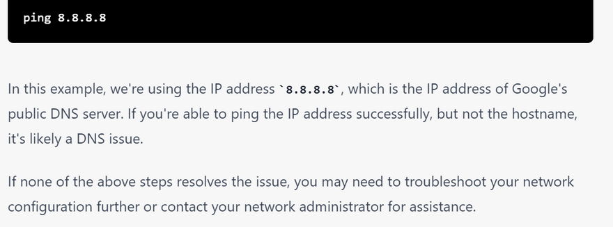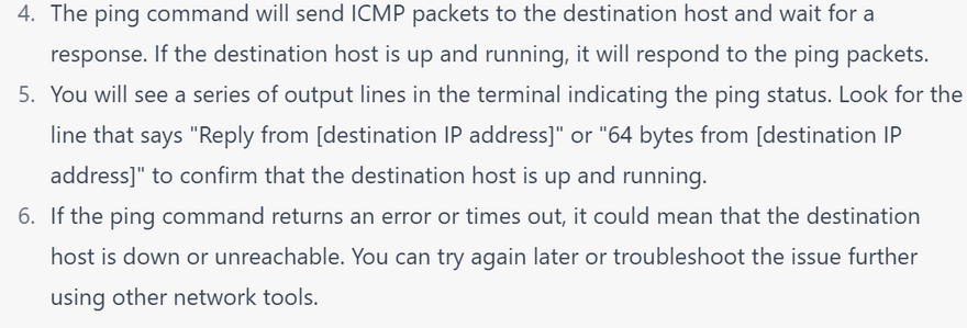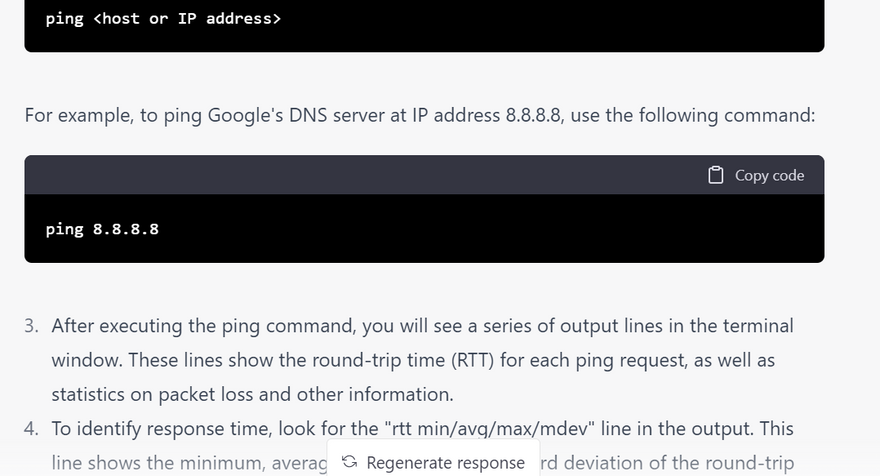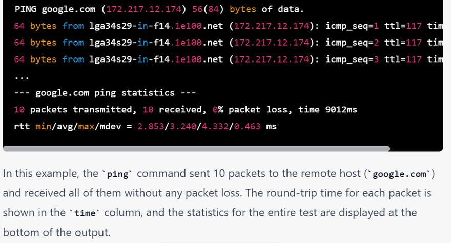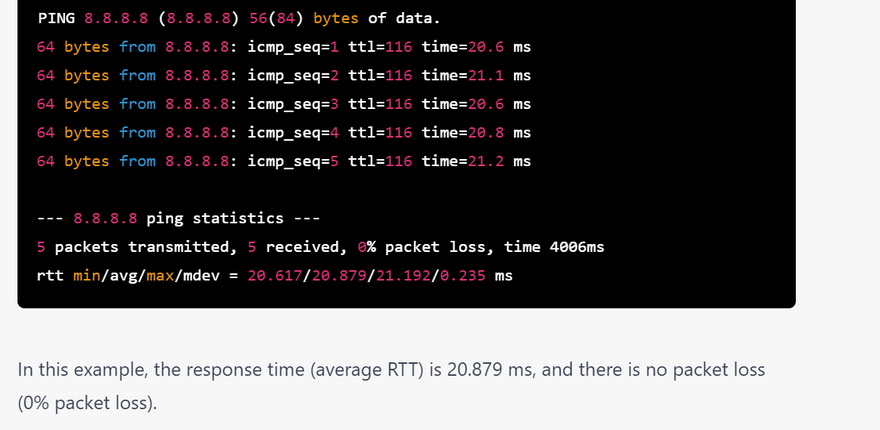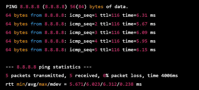 In the example output above, the ping command successfully sent 5 ICMP echo requests to the Google DNS server at IP address 8.8.8.8, and received 5 ICMP echo reply packets back. The response time (also known as round-trip time or RTT) was between 5.67 and 6.31 milliseconds, with an average of 6.02 milliseconds. There was no packet loss. This indicates that the Google DNS server is reachable and responding to ping requests.