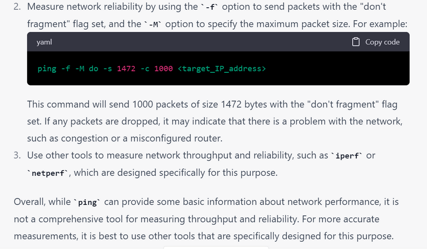 Testing network performance: The ping command can be used to test the performance of a network, such as the throughput and reliability of the network. By performing multiple ping requests and analyzing the results, network administrators can gain insights into the performance of the network.
