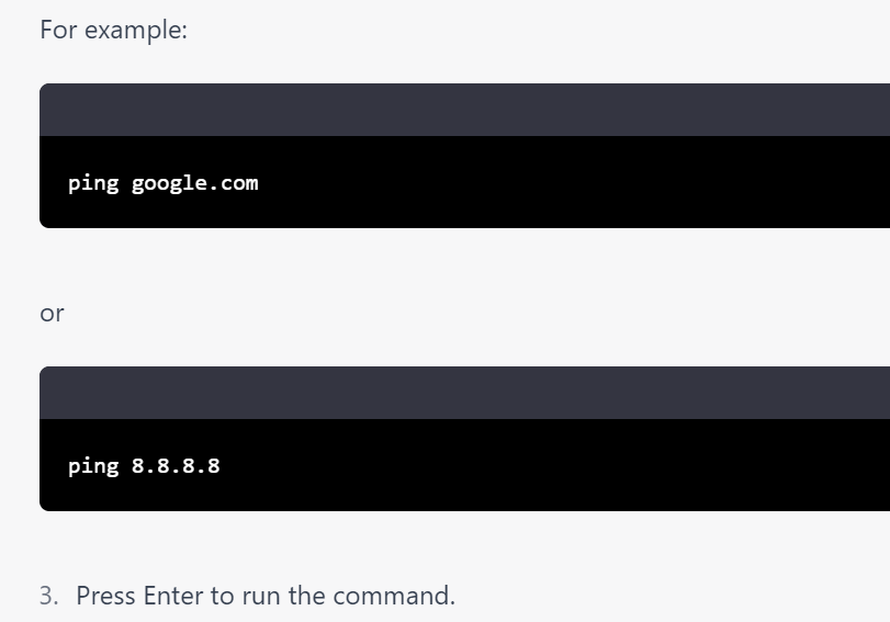 For example, if you want to ping Google's DNS server at IP address 8.8.8.8, you can use the following command: