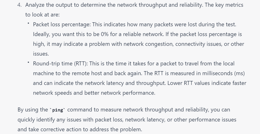 Troubleshooting network issues: The ping command can be used to troubleshoot various network issues, such as connectivity problems, packet loss, and high latency. By analyzing the output of the ping command, network administrators can identify issues and take corrective action.