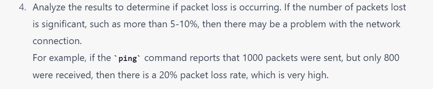 4.Analyze the results to determine if packet loss is occurring. If the number of packets lost is significant, such as more than 5-10%, then there may be a problem with the network connection.