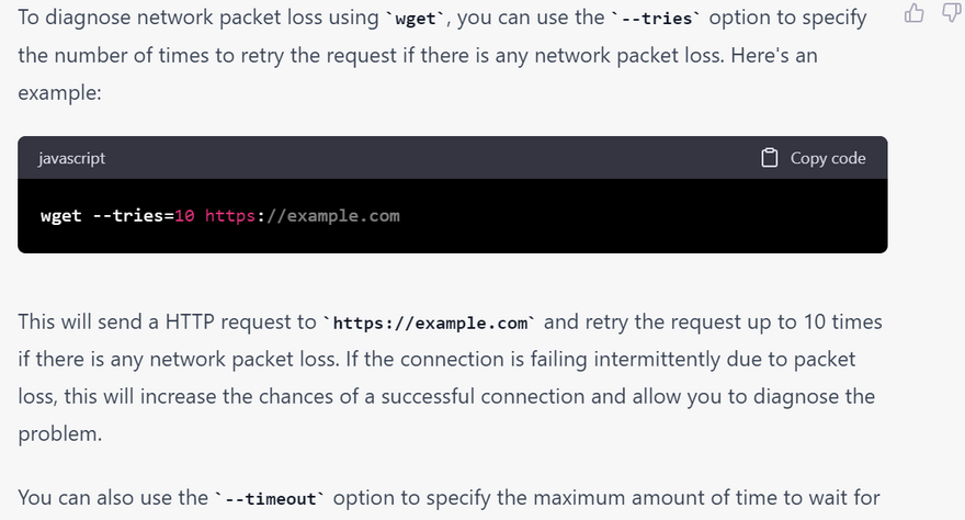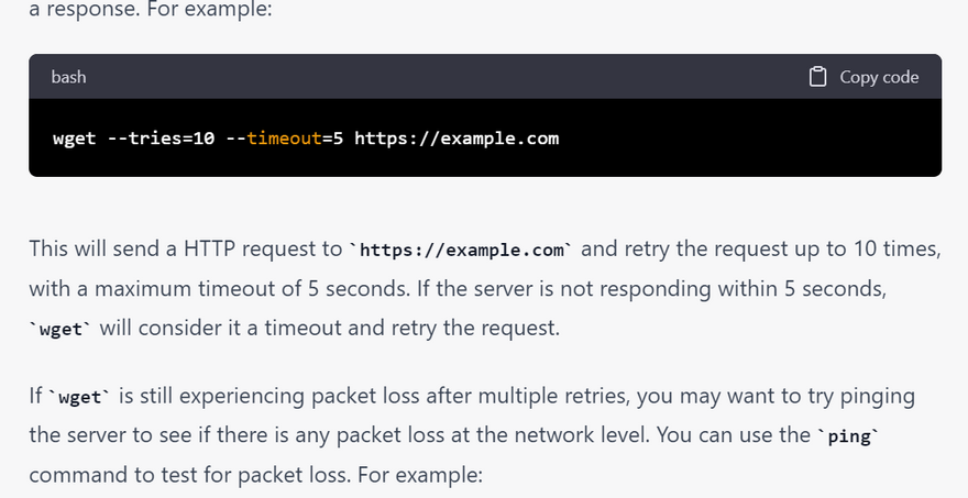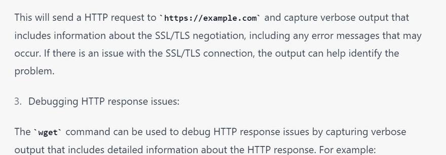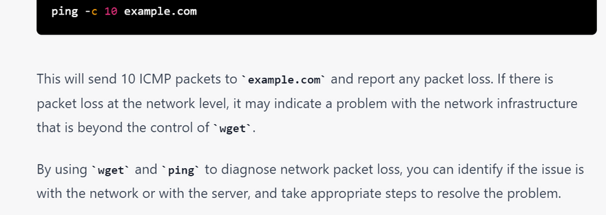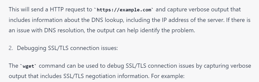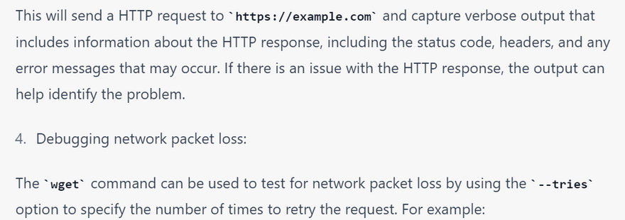 wget is a command-line tool that can be useful for troubleshooting network connections, as it provides various options to test and diagnose network issues. Here are some examples of how to use wget for troubleshooting network connections: