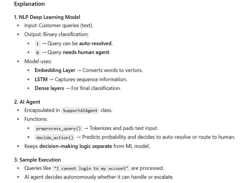 NLP (DL model) understands query → AI Agent solves issue or routes to human.