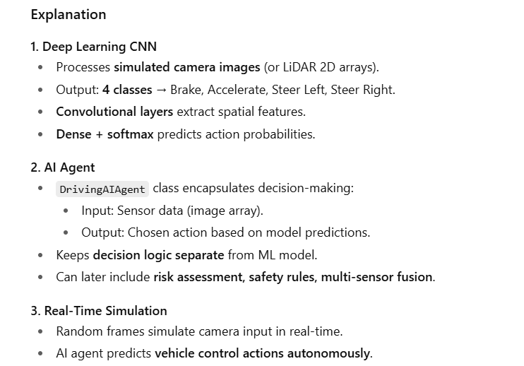 DL processes camera/lidar data → AI Agent decides braking/steering.