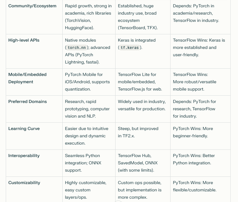Ecosystem: PyTorch has lots of modules for different tasks: neural network building blocks (torch.nn), optimization algorithms (torch.optim), automatic differentiation (torch.autograd), and data handling (torch.utils.data).
