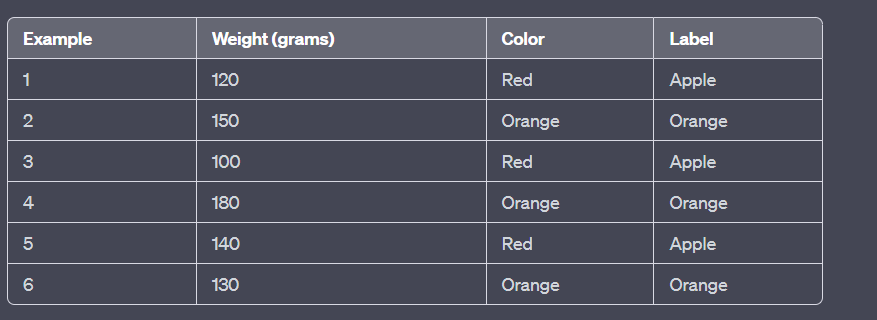 Let's consider a binary classification problem to distinguish between apples and oranges based on their weight and color. We have a training dataset with the following feature vectors and labels: