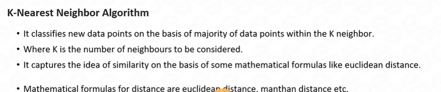 The k-nearest neighbors (k-NN) algorithm is a supervised machine learning algorithm used for both classification and regression tasks. It operates on the principle of finding the k closest training examples in the feature space to a given test example and using them to make predictions.