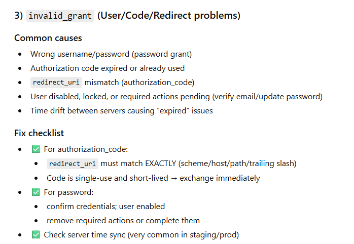invalid_grant (Bad username/password, expired code, wrong redirect_uri)