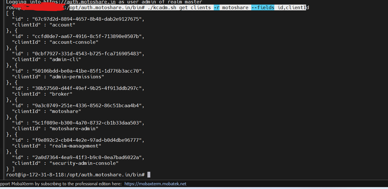 opt/auth.motoshare.in/bin# ./kcadm.sh get clients -r motoshare --fields id,clientI