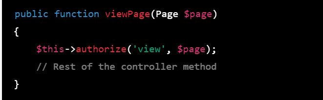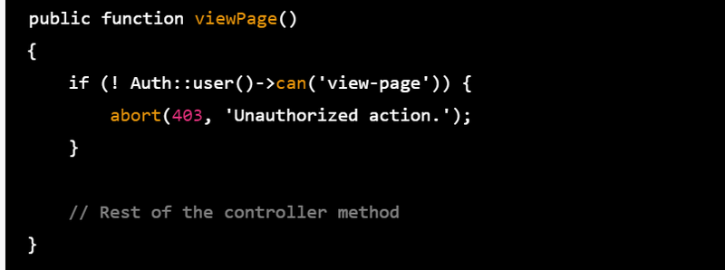 Alternatively, you can use the authorize method in controller constructor or method to check if the user has a specific ability or if the user is authorized to perform a certain action on a resource.