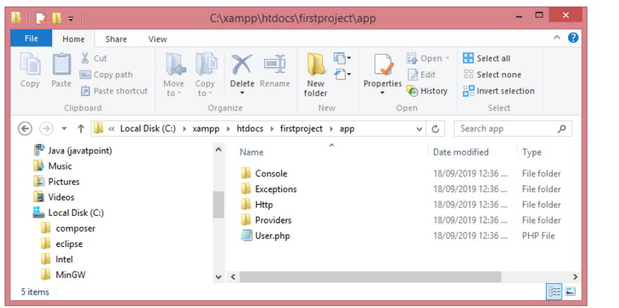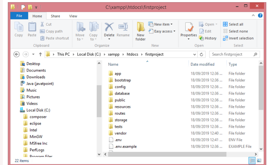 The application structure is the structure of folders, sub-folders, and files available in the project. Once the project is created in Laravel, the application structure generated as shown in the below screenshot: