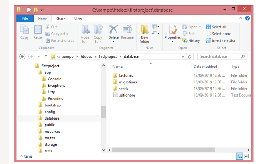 The database directory holds the database files. It contains sub-folders factories, migrations, and seeds. The structure of the database directory is shown below: