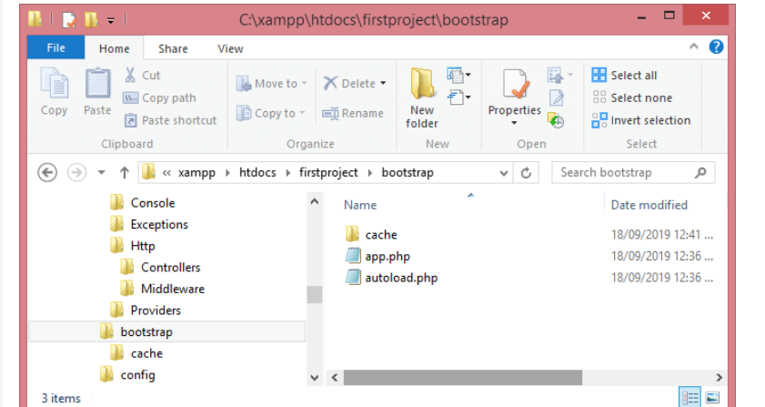 The above screen shows the structure of the bootstrap directory. It contains one folder, i.e., cache and two files, app.php and autoload.php.