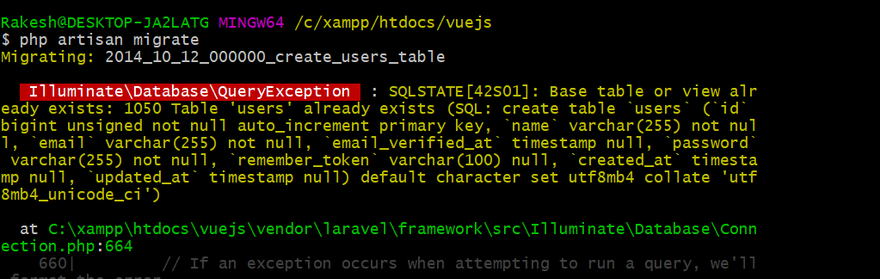 eady exists: 1050 Table 'users' already exists (SQL: create table `users` (`id`