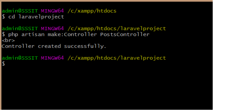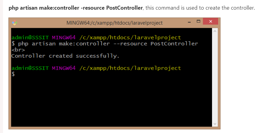 Step 1: Open the Git Bash Window and type the command "php artisan make:Controller PostsController" in Git Bash Window to create the Controller.