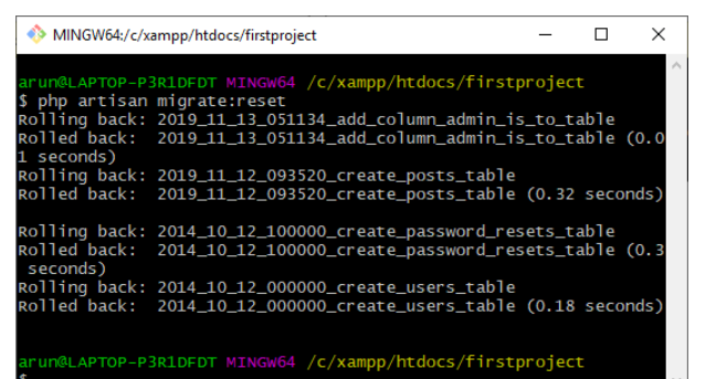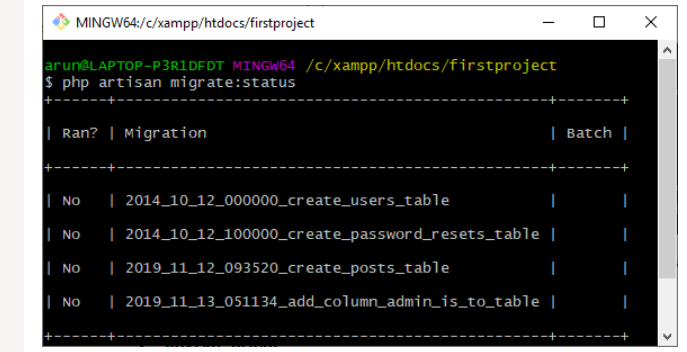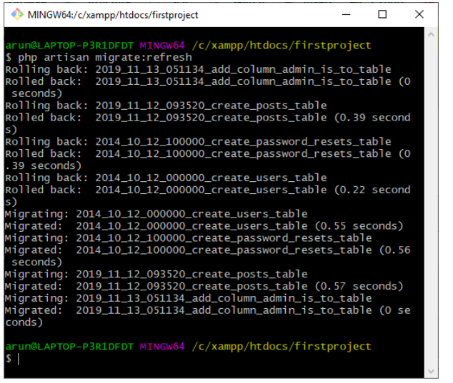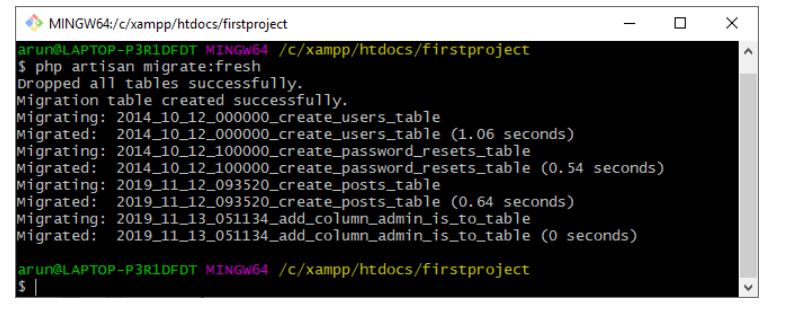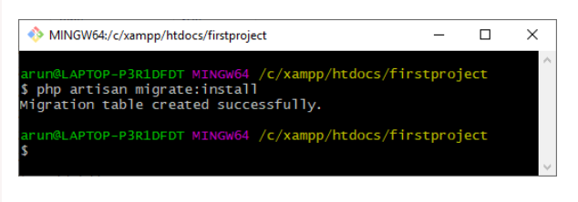 Open the Git Bash window and enter the command "php artisan migrate". The output of this command is shown in the below screenshot: