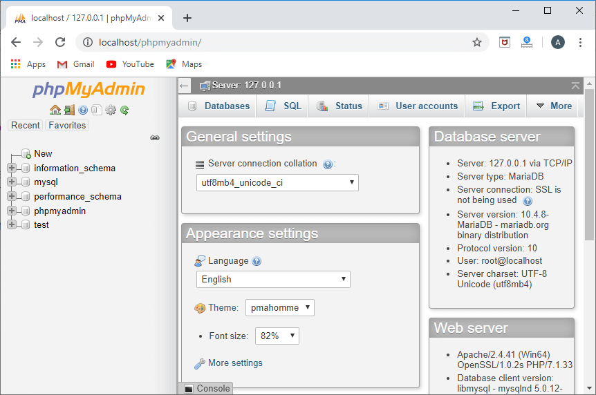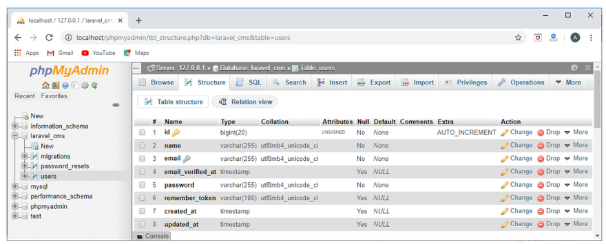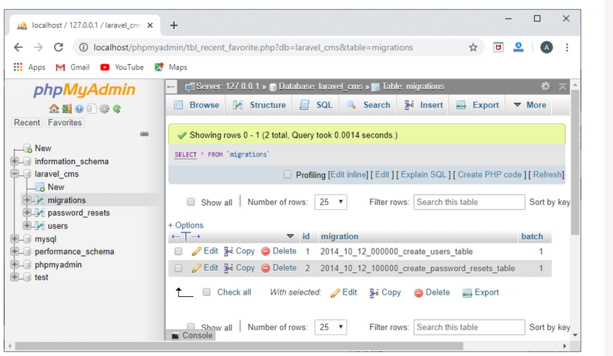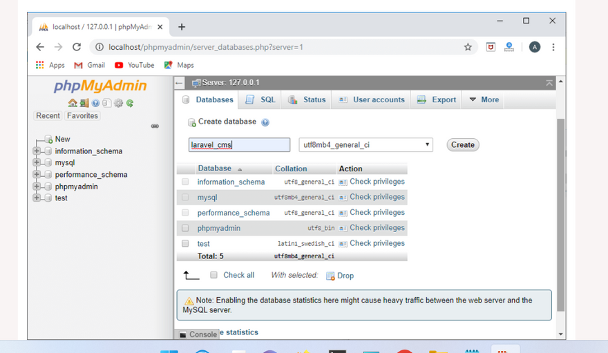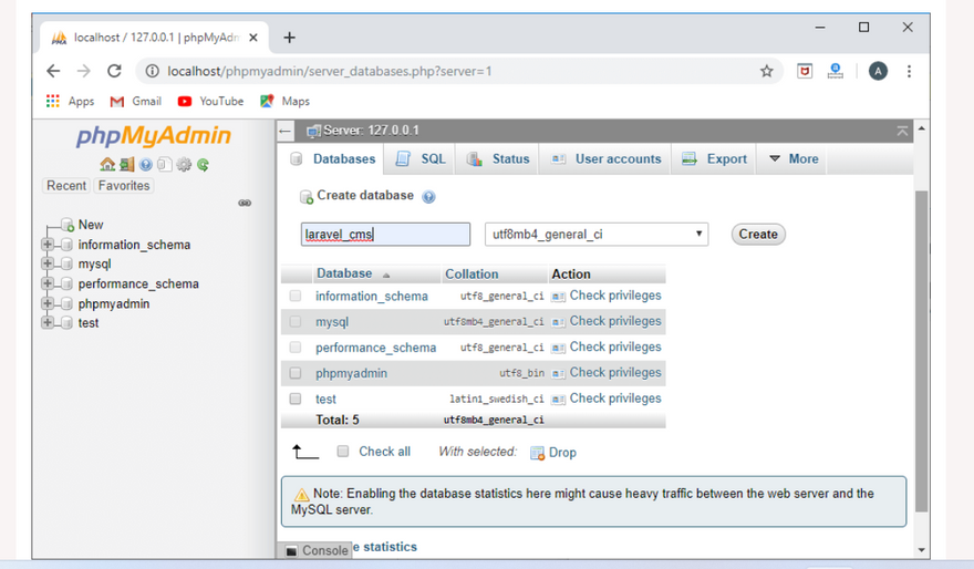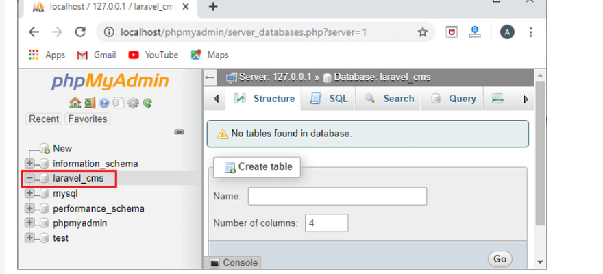 After clicking on the create button, we can see that laravel_cms is created at the left-side of the panel.