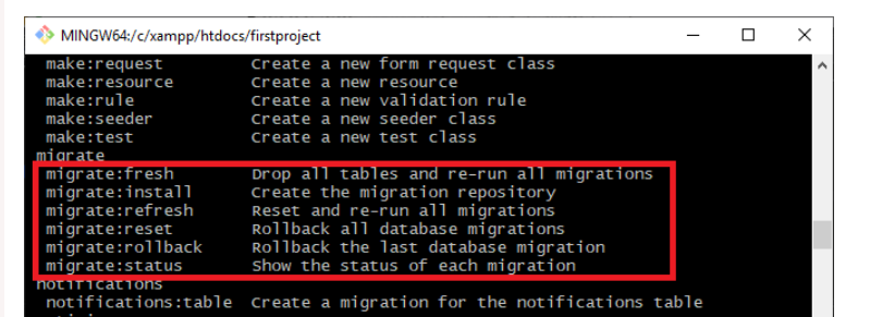 n the above output, the highlighted area is the list of all the migrate commands. There are six commands of migrate in Laravel: