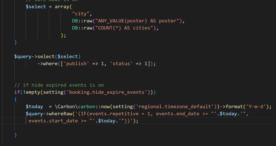 ->where(["events.status" => 1, "events.publish" => 1, "categories.status" => 1]);
