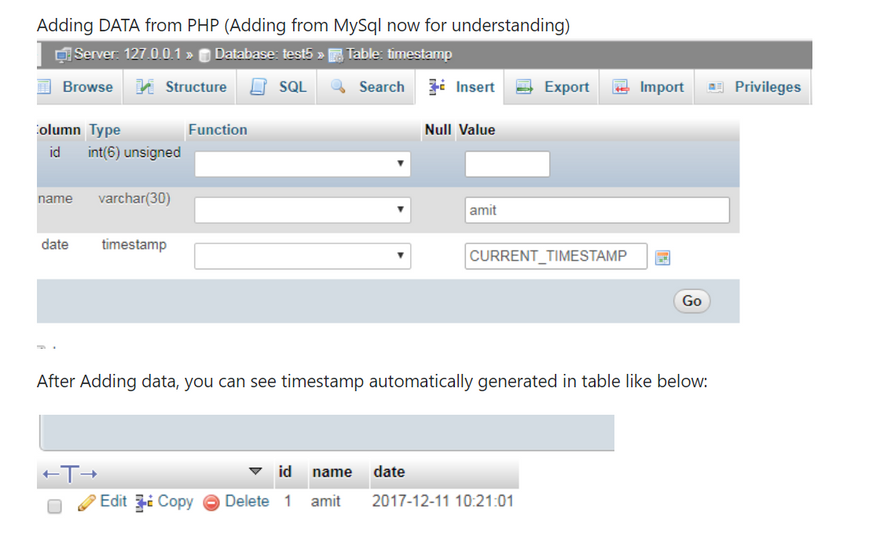 Now next time when you insert any data from PHP to your table, current timestamp will automatically inserted in column like shown below: