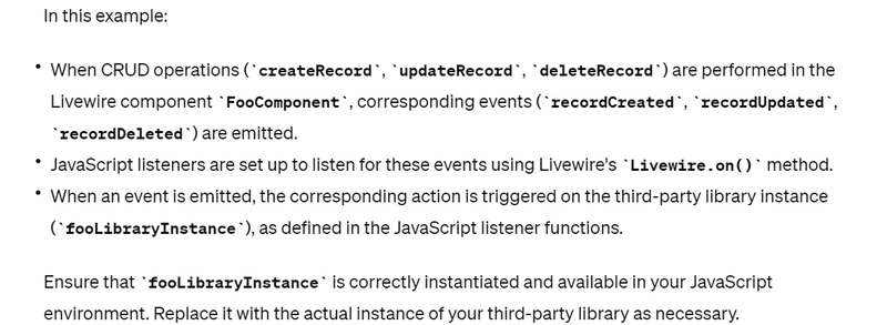 Listeners and Events: Use Livewire listeners and events to communicate between Livewire components and the third-party library. You can emit events from Livewire components and listen for them in JavaScript to trigger actions in the library, and vice versa.