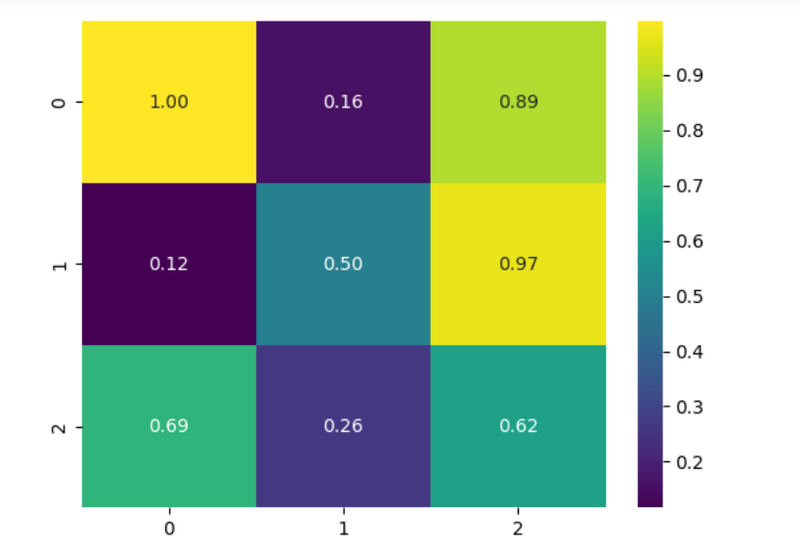 In this example, we use Seaborn's heatmap() function to visualize the tensor. We pass the tensor as input along with the colormap (cmap) parameter specifying 'viridis' colormap. Additionally, we set annot=True to display the numeric values of each cell in the heatmap, and fmt=".2f" to format the annotations to display only two decimal places.