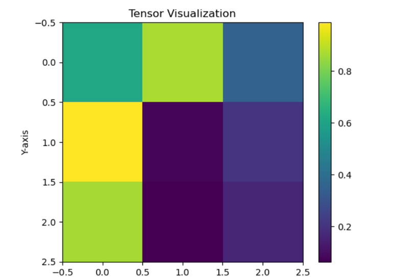 In this example, we create a random 3x3 tensor using NumPy's random.rand() function. Then, we visualize the tensor using imshow() function from matplotlib.pyplot, which displays the tensor as a heatmap. We use the 'viridis' colormap to represent the values in the tensor. Additionally, we add a color bar to indicate the scale of the values. Finally, we set the title, x-label, and y-label for the plot before displaying it using plt.show().