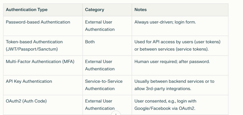 Token-based (JWT, Passport, Sanctum can be for users or services)