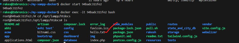 - Start the First Container With the Volume Run your container, mounting the volume to a suitable path. For your requirement, you want the file to end up at /opt/lampp/htdocs/hello.txt. So, mount the volume at /opt/lampp/htdocs: