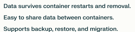 With data stored in volumes, it becomes easier to perform backups and restores. You can back up the data by copying the contents of the volume to a backup location, and in case of a failure, you can restore the data by recreating the volume and copying the data back.