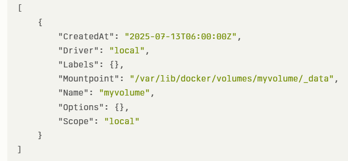 [ { "CreatedAt": "2023-11-26T10:00:00Z", "Driver": "local", "Labels": {}, "Mountpoint": "/var/lib/docker/volumes/myvolume1/_data", "Name": "myvolume1", "Options": {}, "Scope": "local" }]