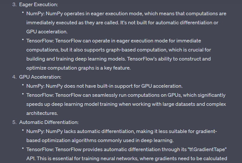 In summary, NumPy is a general-purpose array-processing library, TensorFlow is a machine learning library that includes tools for deep learning, and Keras is a high-level neural networks API that runs on top of TensorFlow. They are often used together for building and training deep learning models. NumPy is more focused on array operations, while TensorFlow and Keras are specialized for machine learning tasks.