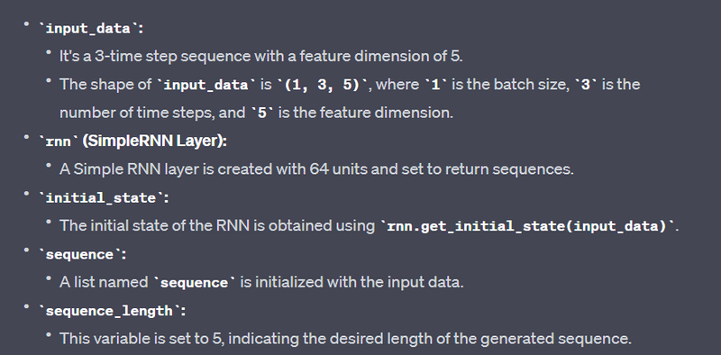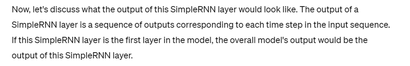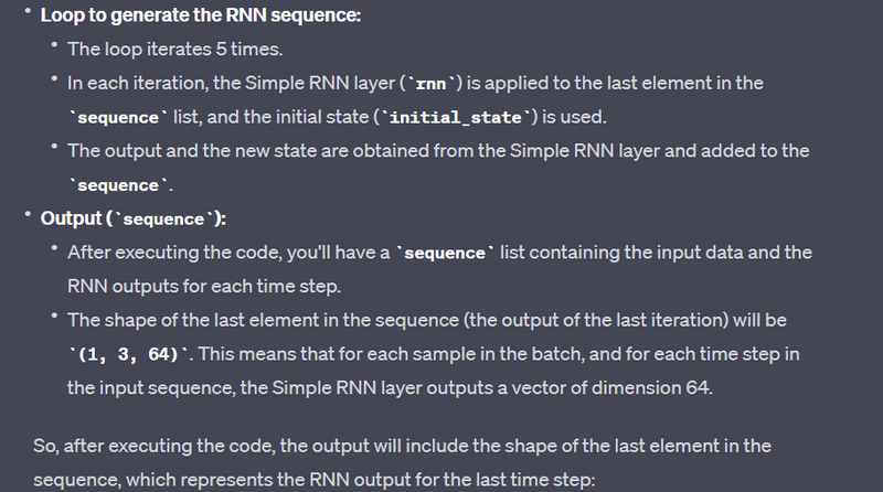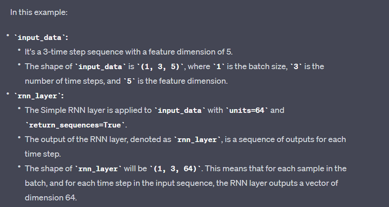 This indicates that for each of the 3 time steps in the sequence, the RNN layer produces a vector of length 64. The return_sequences=True setting ensures that the full sequence of outputs is returned.