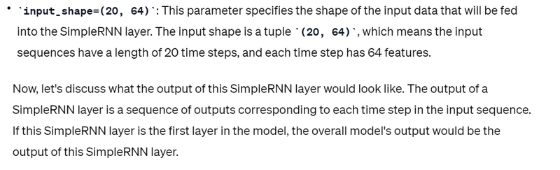 model.add(SimpleRNN(units=64, return_sequences=True, input_shape=(30, 128)))