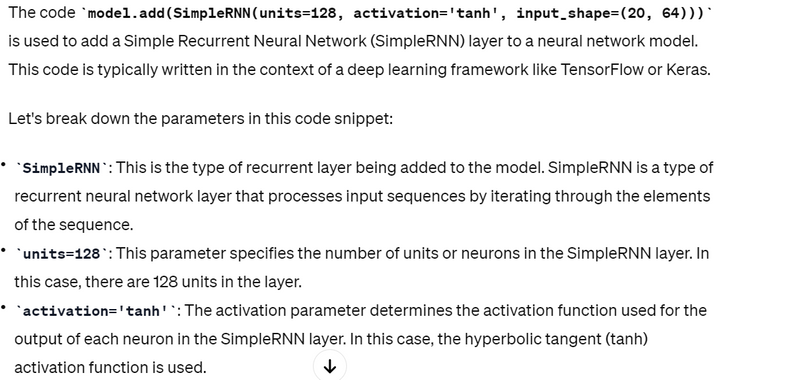 This creates a SimpleRNN layer with 128 units and applies the hyperbolic tangent (tanh) activation function.