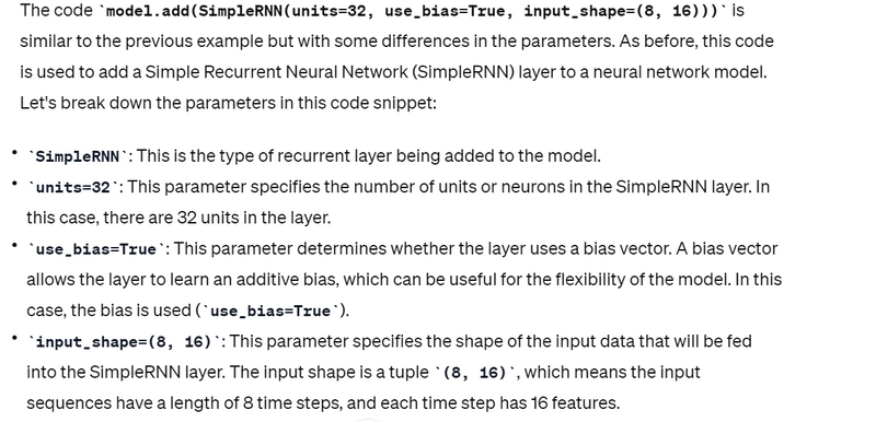 model.add(SimpleRNN(units=32, use_bias=True, input_shape=(8, 16)))