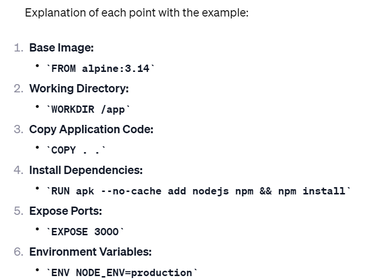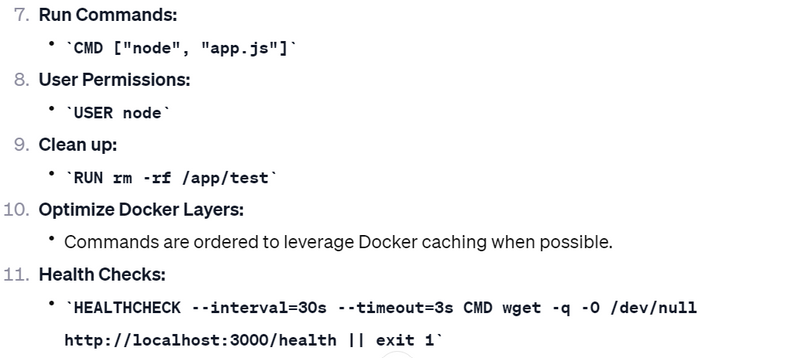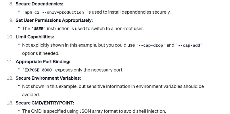 These considerations provide a foundation for enhancing security in Dockerfiles. Customize them based on your application's specific requirements and the security best practices recommended for your chosen technology stack.