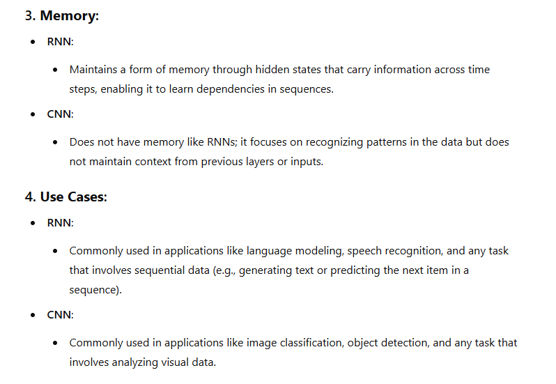 Ability to Capture Sequential Information: RNNs are designed to process sequential data by maintaining an internal state or memory. This makes them suitable for tasks such as time series prediction, natural language processing, and speech recognition, where understanding the order of data is crucial.