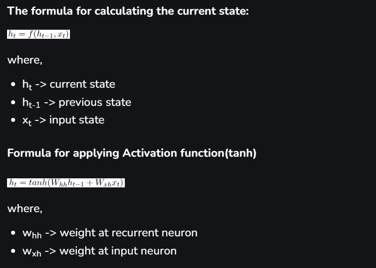 The Recurrent Neural Network consists of multiple fixed activation function units, one for each time step. Each unit has an internal state which is called the hidden state of the unit. This hidden state signifies the past knowledge that the network currently holds at a given time step. This hidden state is updated at every time step to signify the change in the knowledge of the network about the past. The hidden state is updated using the following recurrence relation:-