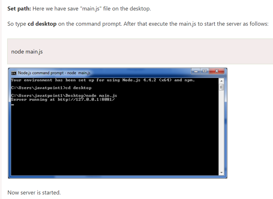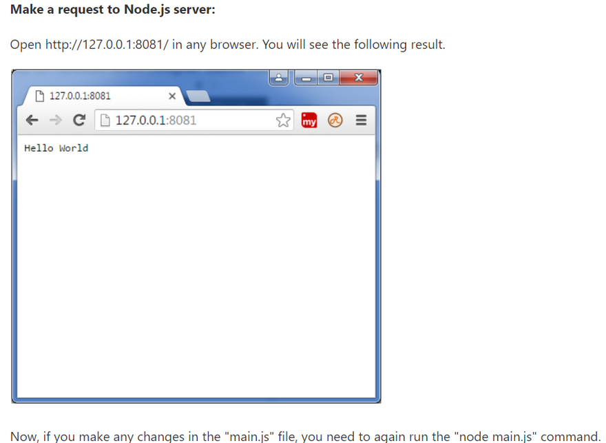 Create server: In the second step, you have to use created http instance and call http.createServer() method to create server instance and then bind it at port 8081 using listen method associated with server instance. Pass it a function with request and response parameters and write the sample implementation to return "Hello World". For example: